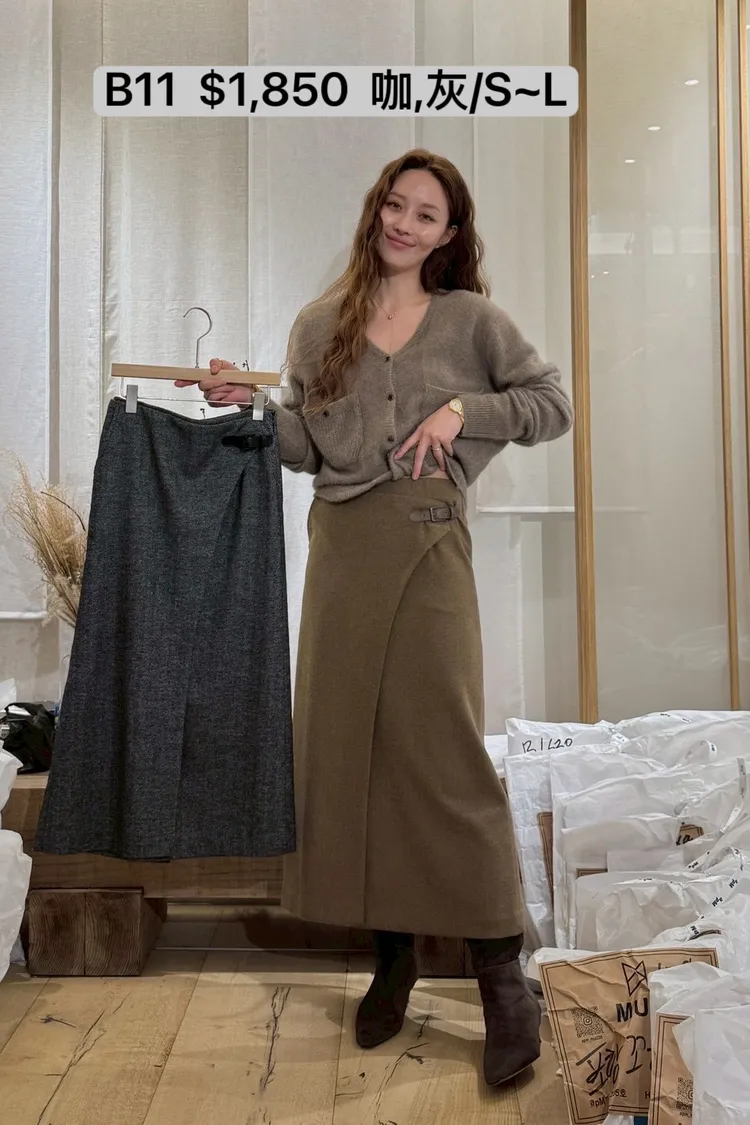 B11 腰頭側邊皮革帶長裙(滌綸52,羊毛37,人造絲9)