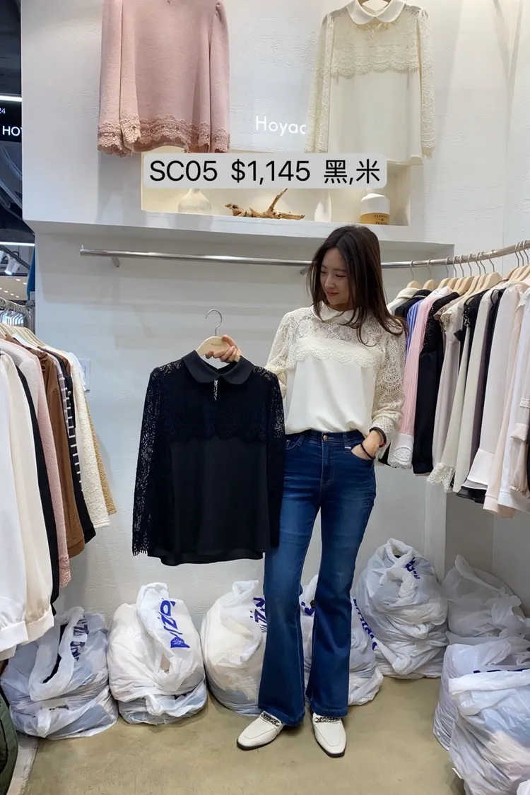 SC05 小圓領鏤空蕾絲領拼接上衣