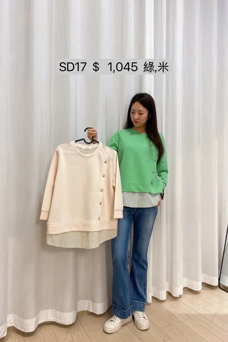 SD17 單邊斜扣條紋拼接七分袖上衣