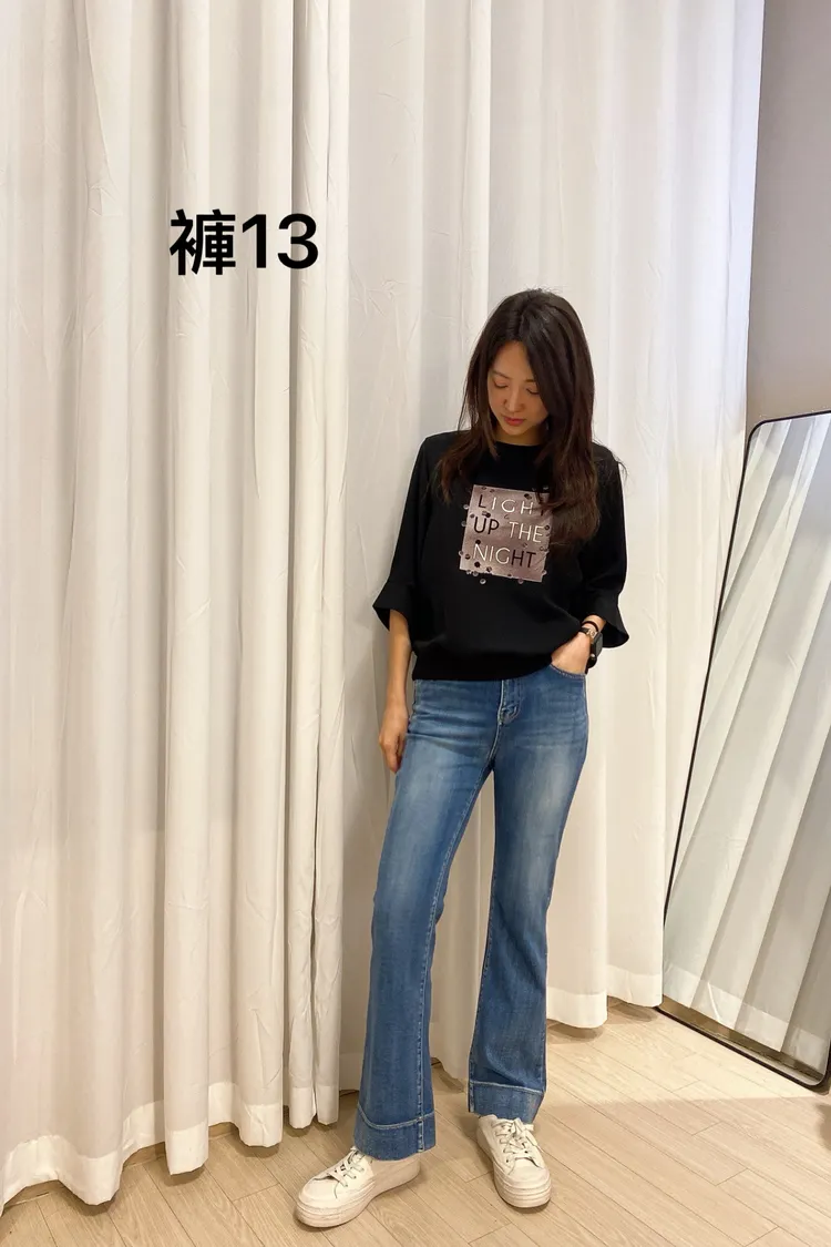 2.修身微喇叭剪裁: 從大腿順著膝蓋延伸向下微散開,