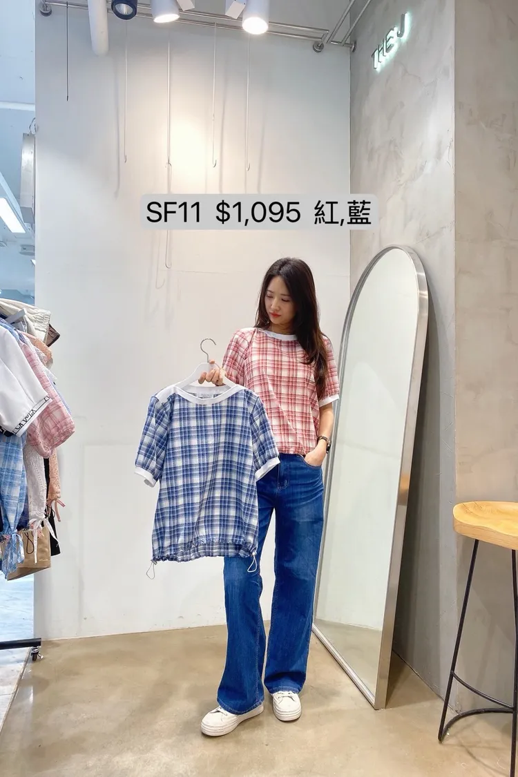 SF11 下擺抽繩彈性領格紋上衣