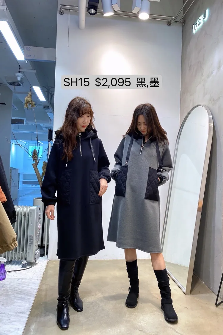 SH15 連帽字母抽繩菱格拼接口袋洋裝